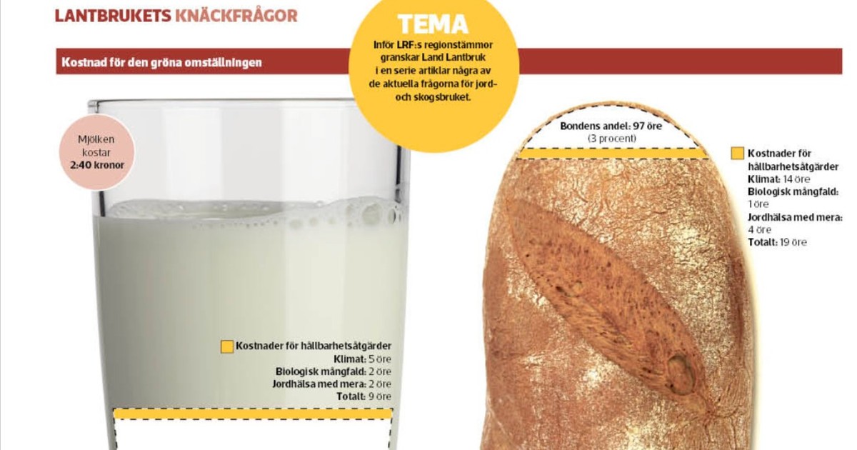Med en veteskörd på 8 000 kilo per hektar, ett vetepris på 2,22 kronor per kilo vete och att cirka 80 procent av en vetekärna blir mjöl så blir bondens andel cirka 97 öre av en brödlimpa som kostar 30 kronor i livsmedelsbutiken. Om veteodlaren får 22 öre till så täcker det kostnaden för att utföra omställningsåtgärderna men det ökar inte den ekonomiska hållbarheten i företaget.